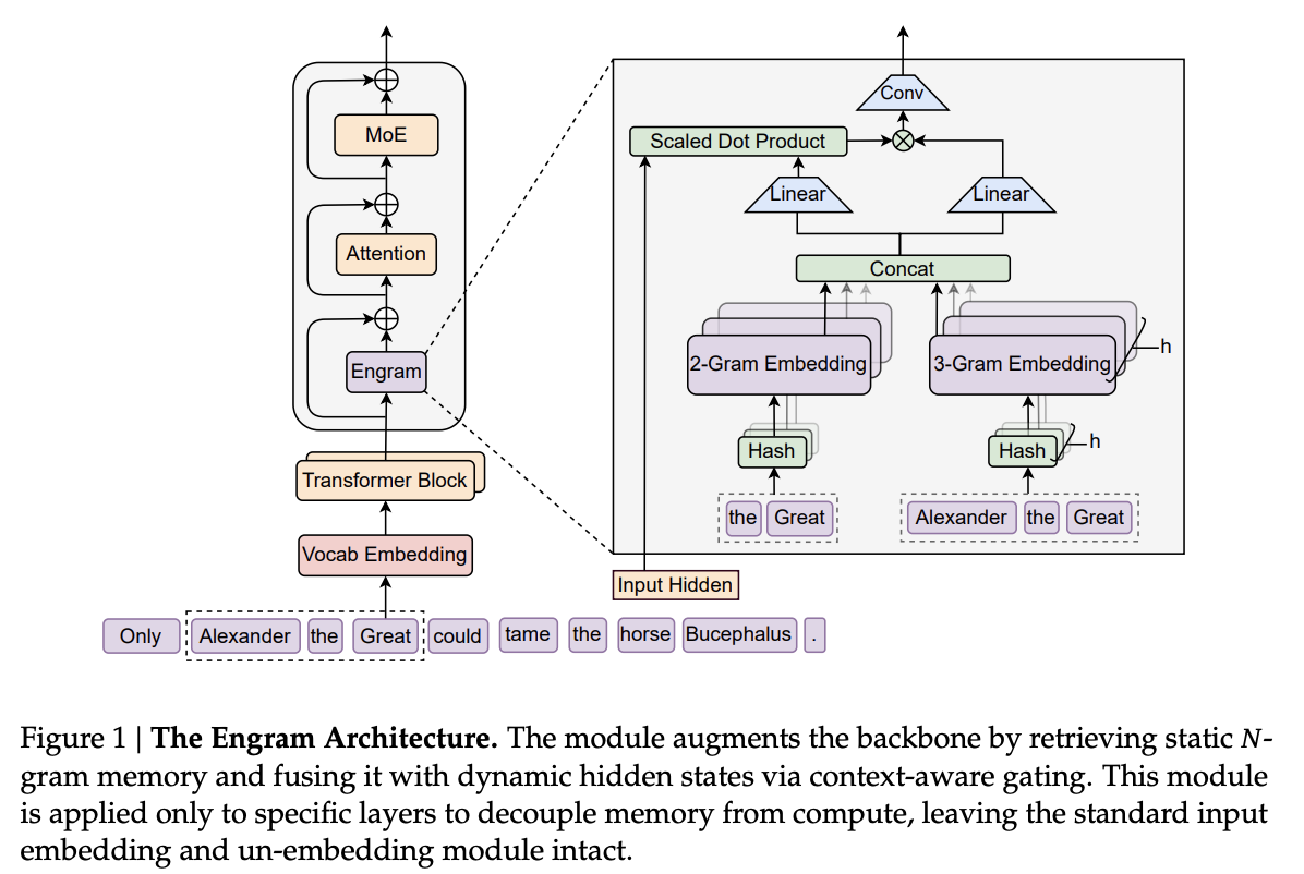 Engramは、古典的なNLP技術である\(N\)-gramモデルの概念を現代的なニューラルネットワークに統合したモジュールである。その中核となるのは、入力トークン列に基づいて静的な埋め込みベクトルを定数時間で検索し、それを文脈に応じて動的に統合する仕組みだ。