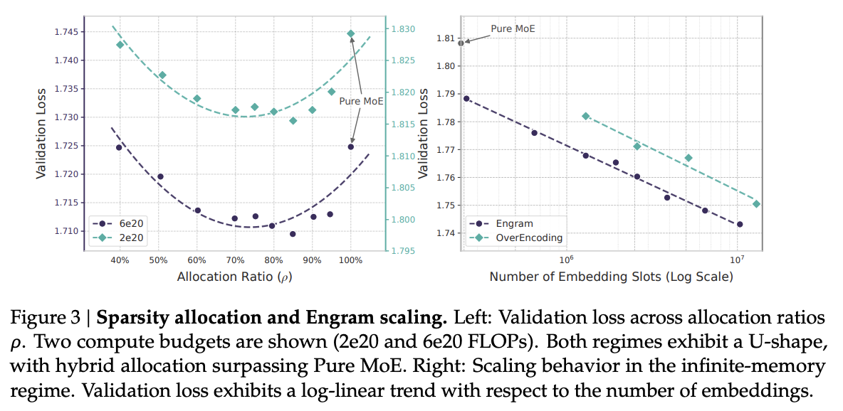 - Optimal Mix (\(\rho \approx 75\%-80\%\)): スパースパラメータの約20〜25%をEngramメモリに割り当て、残りをMoEエキスパートに割り当てる構成が、損失(Loss)を最小化する。